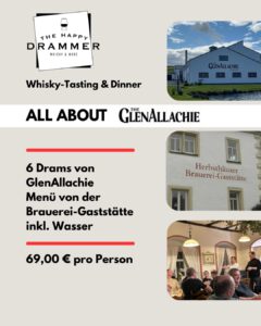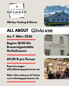Nach dem erfolgreichen Glens und Bens-Tasting im Jahr 2025, kommen wir 2026 zurück nach Herbsthausen! Thema des Tastings wird die Brennerei Glenallachie in der Speyside sein. Wir bieten euch dabei insgesamt 6 Drams aus einem Mix aus Originalabfüllungen (OA) und unabhängigen Abfüllungen (UA) an. Sebastian und sein Team von Herbsthäuser Brauereigaststätte werden euch dabei wieder mit kulinarischen Highlight verwöhnen.