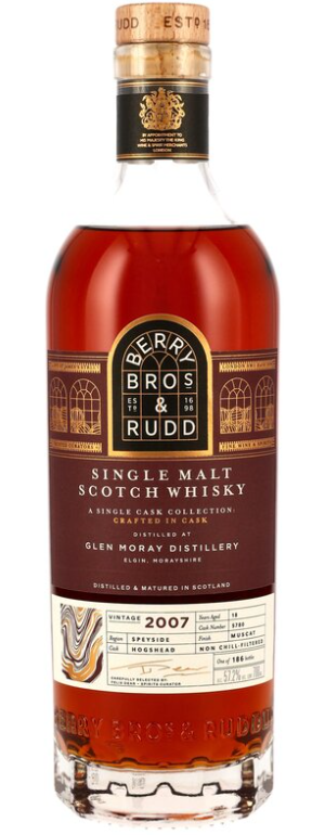 Wir kommen nun zu den Berry Bros-Abfüllungen. Die Erste ist ein Glen Moray mit 18 Jahren, der ein Muscat Cask-Finish erhalten hat. Abgefüllt wurde er mit kräftigen 57,2%.